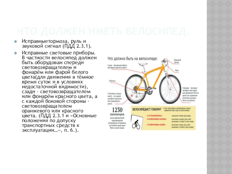 приборы. В частности велосипед должен быть оборудован спереди световозвращателем и фонарём или фарой белого цвета(для движения в тёмное время суток и в условиях недостаточной видимости), сзади - световозвращателем или фонарём красного цвета, а с каждой боковой стороны - световозвращателем оранжевого или красного цвета. (ПДД 2.3.1 и «Основные положения по допуску транспортных средств к эксплуатации…», п. 6.).