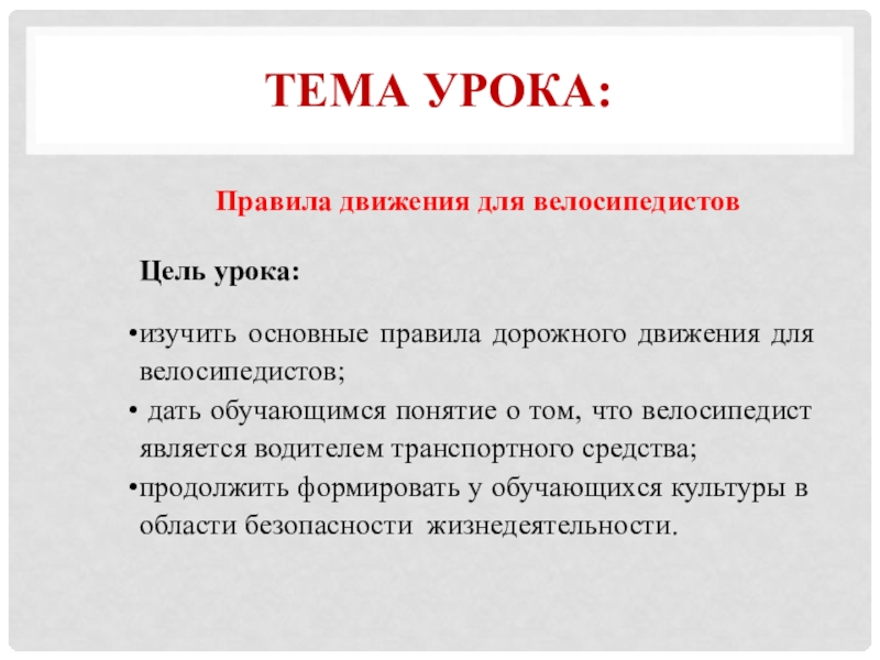 дать обучающимся понятие о том, что велосипедист является водителем транспортного средства;