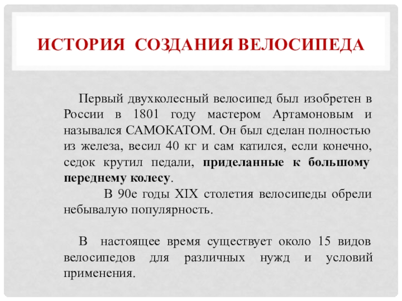 Слайд 7ИСТОРИЯ СОЗДАНИЯ ВЕЛОСИПЕДА