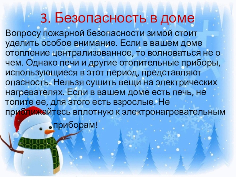 Если в вашем доме отопление централизованное, то волноваться не о чем. Однако печи и другие отопительные приборы, использующиеся в этот период, представляют опасность. Нельзя сушить вещи на электрических нагревателях. Если в вашем доме есть печь, не топите ее, для этого есть взрослые. Не приближайтесь вплотную к электронагревательным