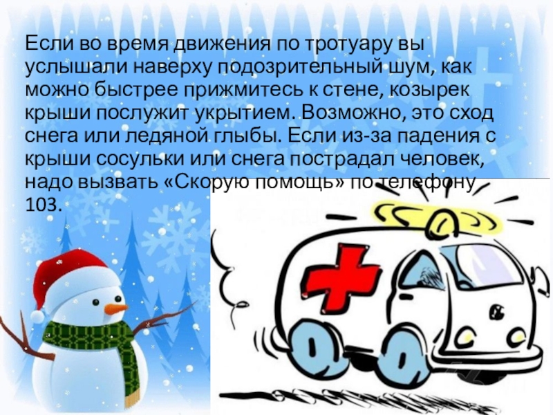 как можно быстрее прижмитесь к стене, козырек крыши послужит укрытием. Возможно, это сход снега или ледяной глыбы. Если из-за падения с крыши сосульки или снега пострадал человек, надо вызвать «Скорую помощь» по телефону 103.