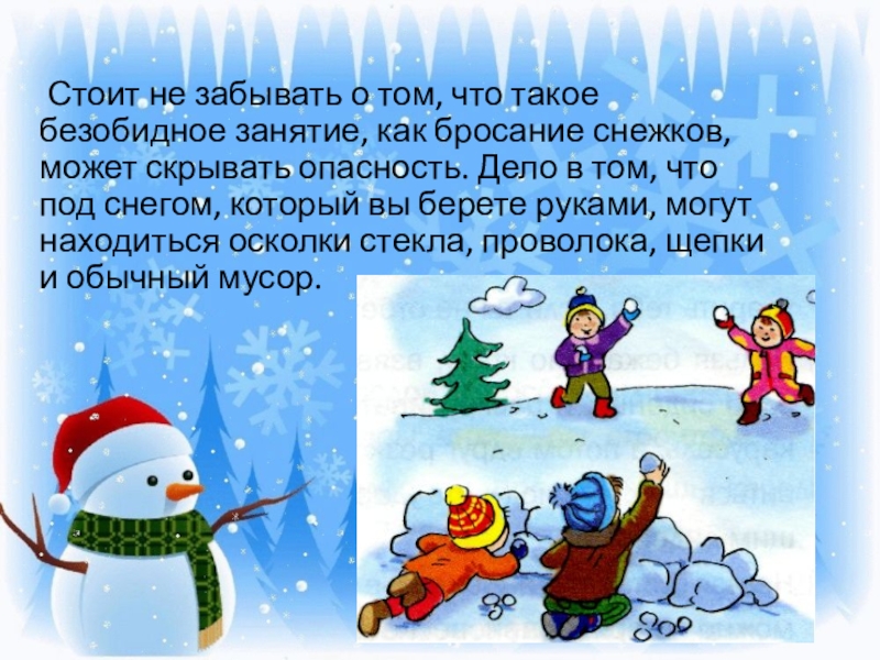 бросание снежков, может скрывать опасность. Дело в том, что под снегом, который вы берете руками, могут находиться осколки стекла, проволока, щепки и обычный мусор.