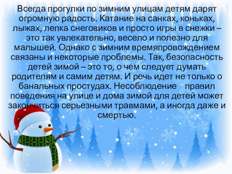 санках, коньках, лыжах, лепка снеговиков и просто игры в снежки – это так увлекательно, весело и полезно для малышей. Однако с зимним времяпровождением связаны и некоторые проблемы. Так, безопасность детей зимой – это то, о чем следует думать родителям и самим детям. И речь идет не только о банальных простудах. Несоблюдение правил поведения на улице и дома зимой для детей может закончиться серьезными травмами, а иногда даже и смертью.