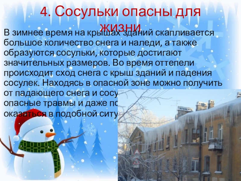 большое количество снега и наледи, а также образуются сосульки, которые достигают значительных размеров. Во время оттепели происходит сход снега с крыш зданий и падения сосулек. Находясь в опасной зоне можно получить от падающего снега и сосулек очень тяжелые и опасные травмы и даже погибнуть. Чтобы не оказаться в подобной ситуации следует: