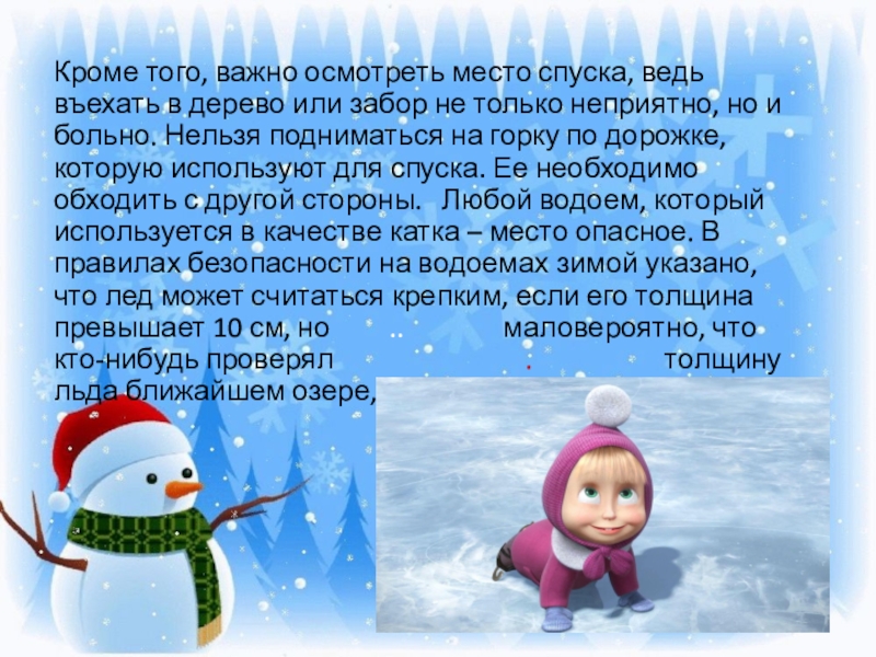 забор не только неприятно, но и больно. Нельзя подниматься на горку по дорожке, которую используют для спуска. Ее необходимо обходить с другой стороны. Любой водоем, который используется в качестве катка – место опасное. В правилах безопасности на водоемах зимой указано, что лед может считаться крепким, если его толщина превышает 10 см, но .. маловероятно, что кто-нибудь проверял . толщину льда ближайшем озере, реке.