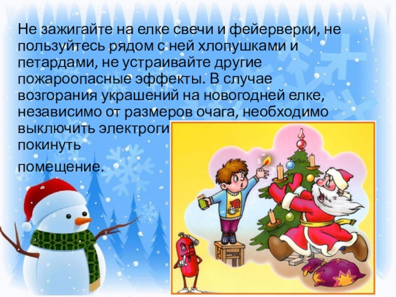 ней хлопушками и петардами, не устраивайте другие пожароопасные эффекты. В случае возгорания украшений на новогодней елке, независимо от размеров очага, необходимо выключить электрогирлянду и немедленно покинуть