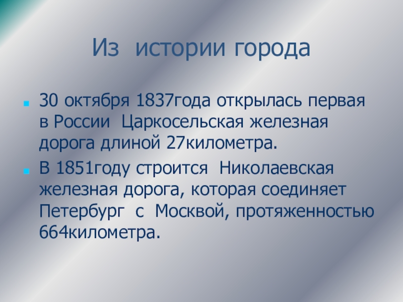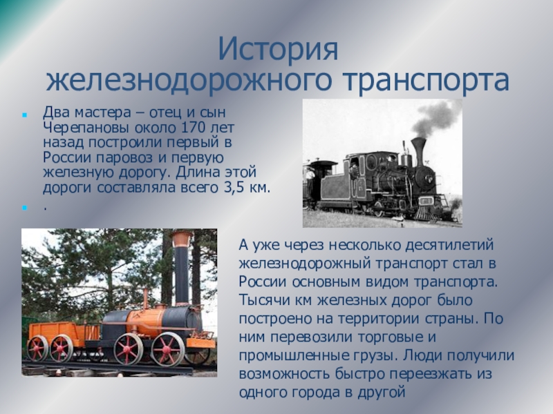 А уже через несколько десятилетий железнодорожный транспорт стал в России основным видом транспорта. Тысячи км железных дорог было построено на территории страны. По ним перевозили торговые и промышленные грузы. Люди получили возможность быстро переезжать из одного города в другой