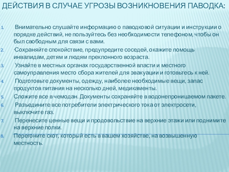 Слайд 6Действия в случае угрозы возникновения паводка: