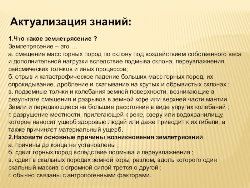по склону под воздействием собственного веса и дополнительной нагрузки вследствие подмыва склона, переувлажнения, сейсмических толчков и иных процессов;