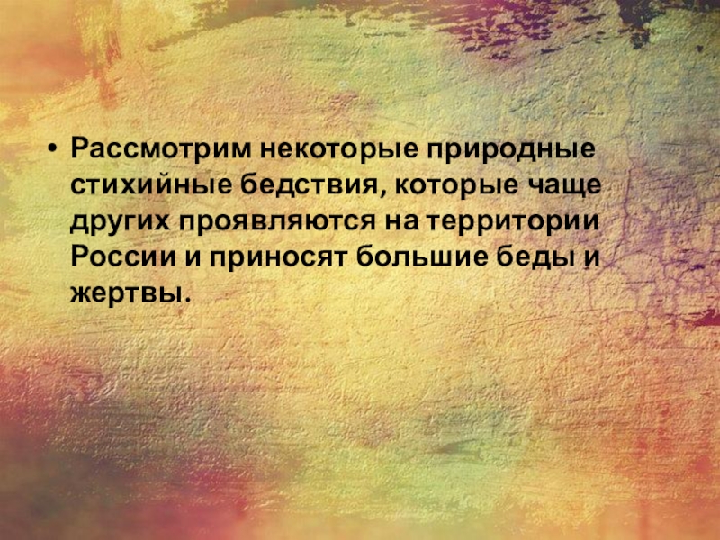 Слайд 9Рассмотрим некоторые природные стихийные бедствия, которые чаще других проявляются на территории