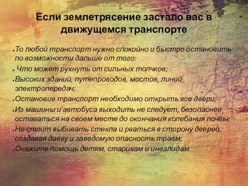 Слайд 12Если землетрясение застало вас в движущемся транспорте