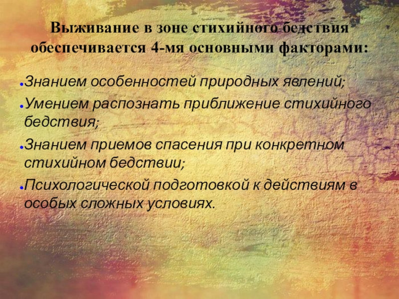 Слайд 8Выживание в зоне стихийного бедствия обеспечивается 4-мя основными факторами: