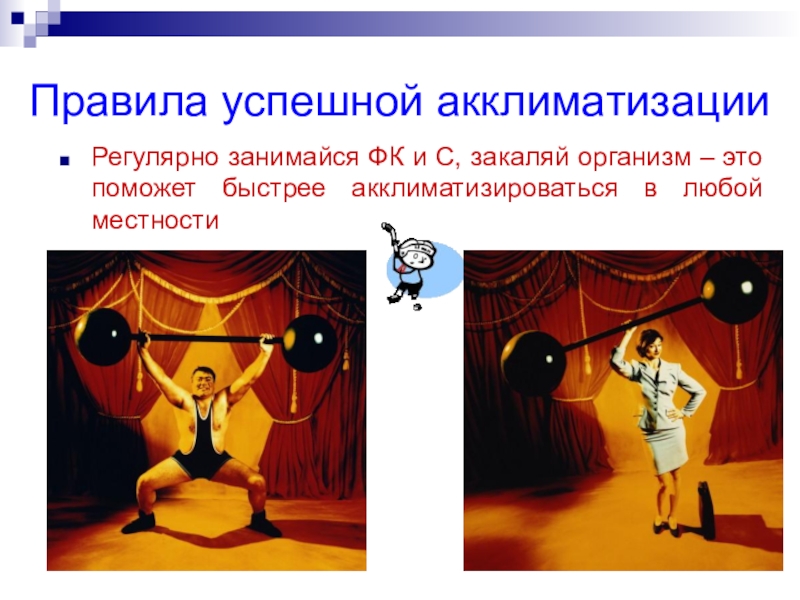 Правила успешной акклиматизацииРегулярно занимайся ФК и С, закаляй организм – это поможет быстрее акклиматизироваться в любой местности