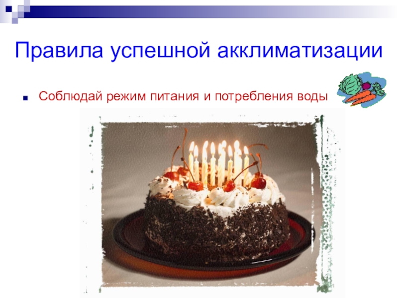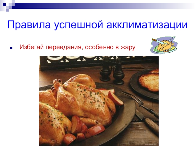 Правила успешной акклиматизации Осторожно переходи к новым кушаньям, т.к. незнакомая пища может привести к расстройству желудка и