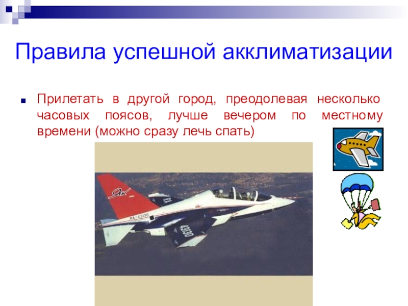 Правила успешной акклиматизацииПрилетать в другой город, преодолевая несколько часовых поясов, лучше вечером по местному времени (можно сразу