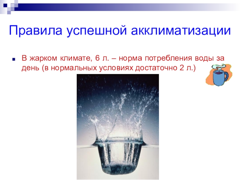 Правила успешной акклиматизацииВ жарком климате, 6 л. – норма потребления воды за день (в нормальных условиях достаточно