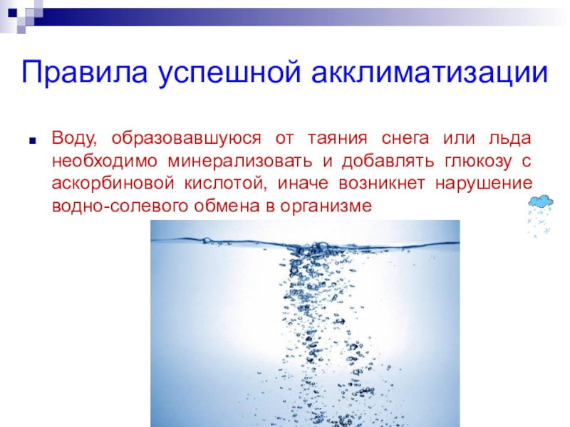 Правила успешной акклиматизацииВоду, образовавшуюся от таяния снега или льда необходимо минерализовать и добавлять глюкозу с аскорбиновой кислотой,