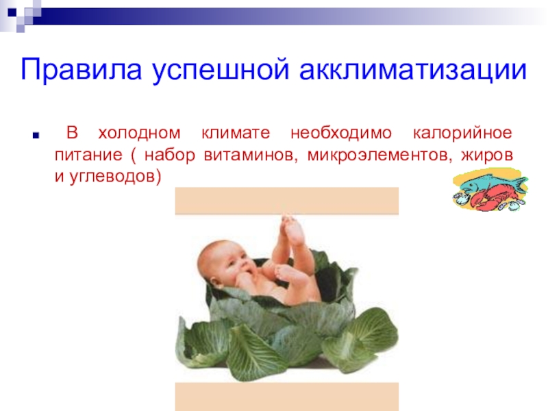 Правила успешной акклиматизации В холодном климате необходимо калорийное питание ( набор витаминов, микроэлементов, жиров и углеводов)