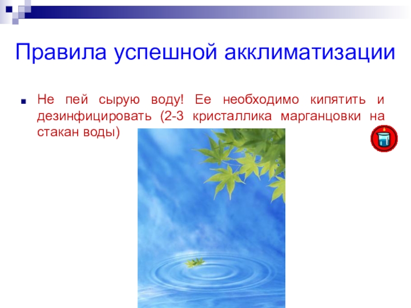 Правила успешной акклиматизацииНе пей сырую воду! Ее необходимо кипятить и дезинфицировать (2-3 кристаллика марганцовки на стакан воды)