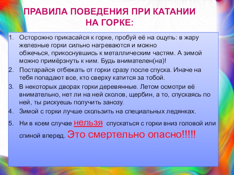 Правила поведения при катании на горке:Осторожно прикасайся к горке, пробуй её на ощупь: в жару железные горки сильно нагреваются и можно обжечься, прикоснувшись к металлическим час­тям. А зимой можно примёрзнуть к ним. Будь внимателен(на)!Постарайся отбежать от горки сразу после спуска. Иначе