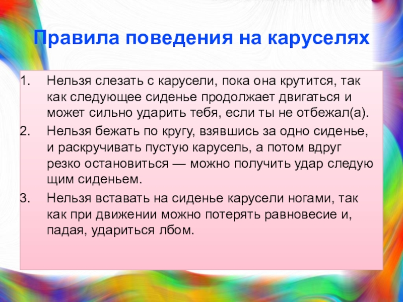 Правила поведения на каруселяхНельзя слезать с карусели, пока она крутится, так как следующее сиденье продолжает двигаться и может сильно ударить