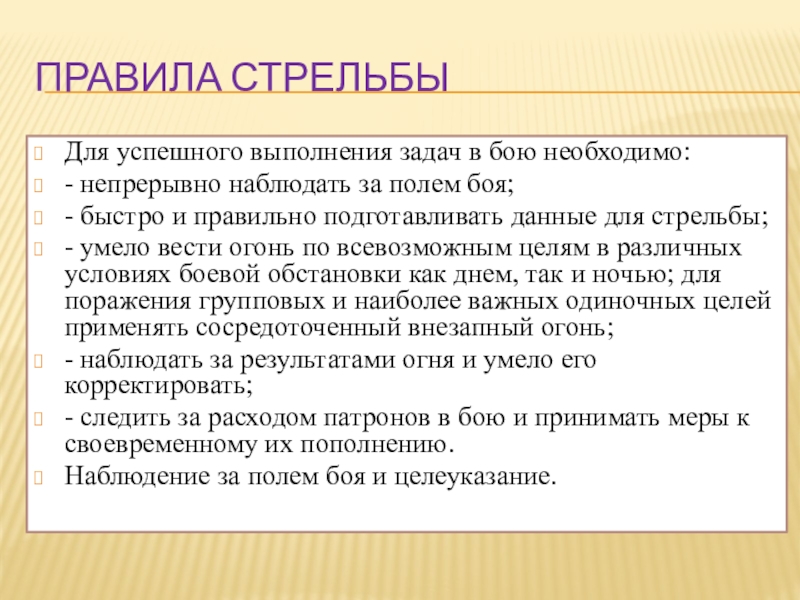 - умело вести огонь по всевозможным целям в различных условиях боевой обстановки как днем, так и ночью; для поражения групповых и наиболее важных одиночных целей применять сосредоточенный внезапный огонь;