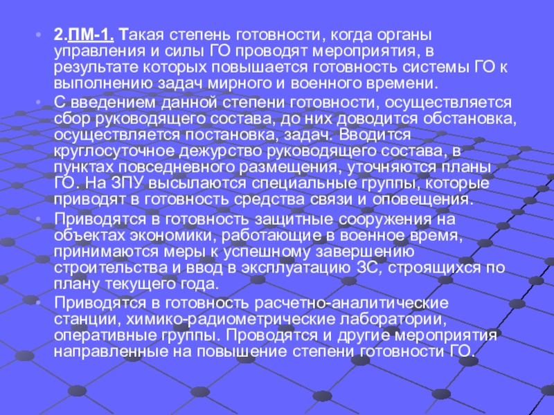 Слайд 162.ПМ-1. Такая степень готовности, когда органы управления и силы ГО проводят