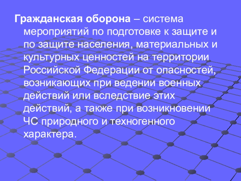 защите населения, материальных и культурных ценностей на территории Российской Федерации от опасностей, возникающих при ведении военных действий или вследствие этих действий, а также при возникновении ЧС природного и техногенного характера.