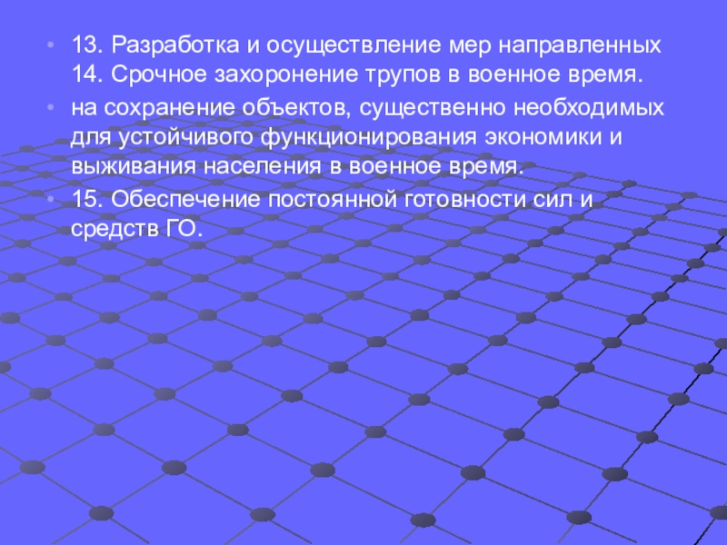 Слайд 913. Разработка и осуществление мер направленных 14. Срочное захоронение трупов в