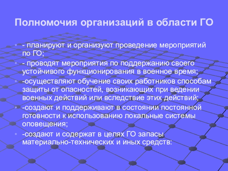 ГО в полном объеме, организуют и проводят предусмотренные планами мероприятия, обеспечивающие выполнение всех задач, возложенных на ГО в военное время.