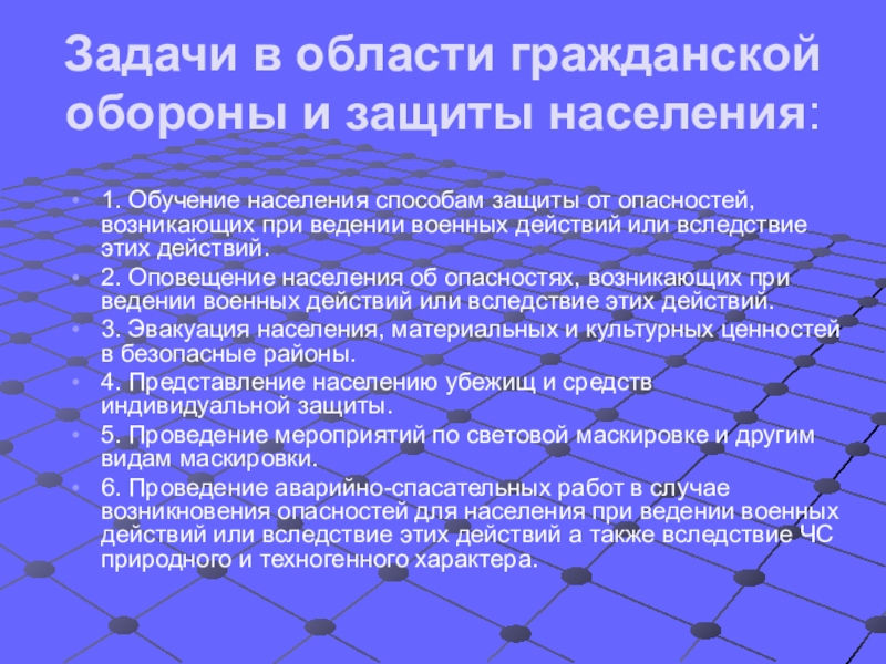 Слайд 7Задачи в области гражданской обороны и защиты населения: