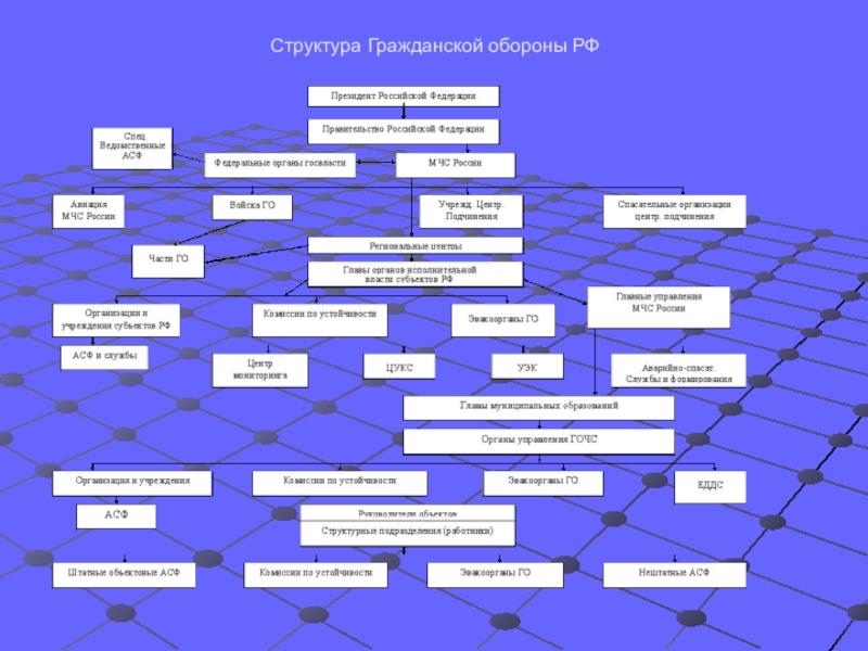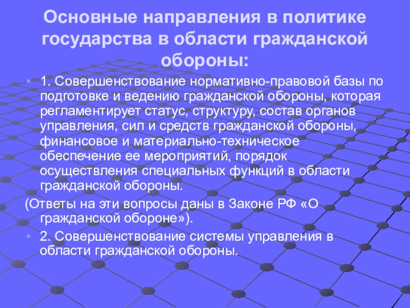 базы по подготовке и ведению гражданской обороны, которая регламентирует статус, структуру, состав органов управления, сил и средств гражданской обороны, финансовое и материально-техническое обеспечение ее мероприятий, порядок осуществления специальных функций в области гражданской обороны.