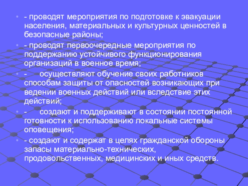 Слайд 12- проводят мероприятия по подготовке к эвакуации населения, материальных и культурных