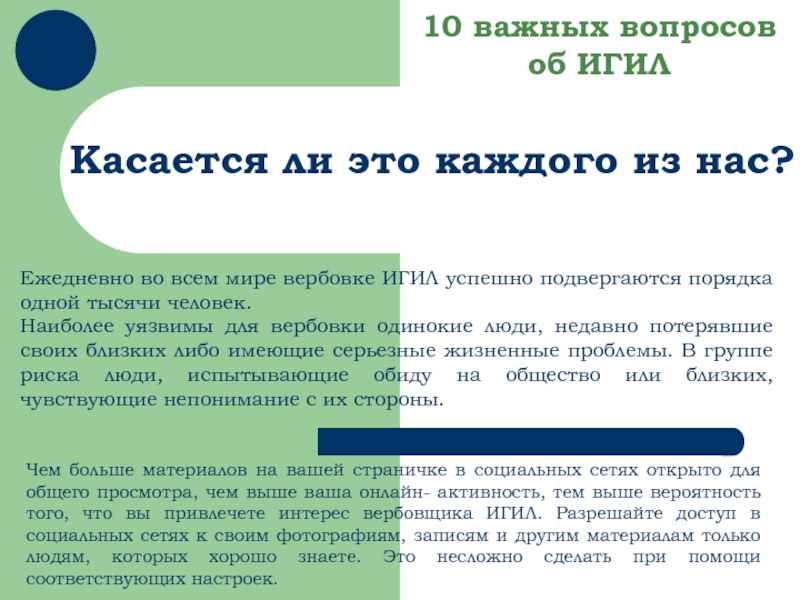 Чем больше материалов на вашей страничке в социальных сетях открыто для общего просмотра, чем выше ваша онлайн- активность, тем выше вероятность того, что вы привлечете интерес вербовщика ИГИЛ. Разрешайте доступ в социальных сетях к своим фотографиям, записям и другим материалам только людям, которых хорошо знаете. Это несложно сделать при помощи соответствующих настроек.