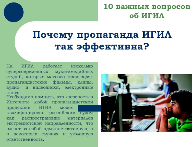 Необходимо помнить, что «перепост» в Интернете любой пропагандистской продукции ИГИЛ может быть квалифицирован российским судом как распространение материалов экстремистской направленности, что влечет за собой административную, а в некоторых случаях и уголовную ответственность.