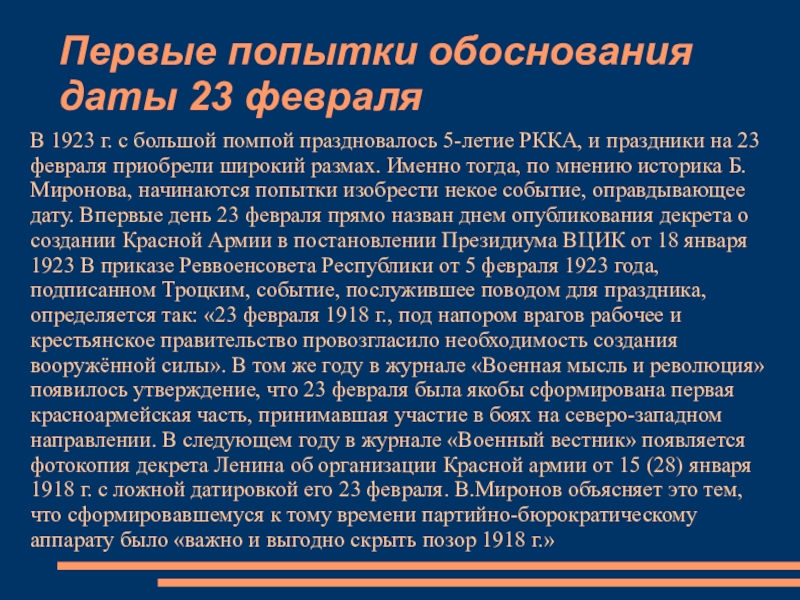 праздновалось 5-летие РККА, и праздники на 23 февраля приобрели широкий размах. Именно тогда, по мнению историка Б.Миронова, начинаются попытки изобрести некое событие, оправдывающее дату. Впервые день 23 февраля прямо назван днем опубликования декрета о создании Красной Армии в постановлении Президиума ВЦИК от 18 января 1923 В приказе Реввоенсовета Республики от 5 февраля 1923 года, подписанном Троцким, событие, послужившее поводом для праздника, определяется так: «23 февраля 1918 г., под напором врагов рабочее и крестьянское правительство провозгласило необходимость создания вооружённой силы». В том же году в журнале «Военная мысль и революция» появилось утверждение, что 23 февраля была якобы сформирована первая красноармейская часть, принимавшая участие в боях на северо-западном направлении. В следующем году в журнале «Военный вестник» появляется фотокопия декрета Ленина об организации Красной армии от 15 (28) января 1918 г. с ложной датировкой его 23 февраля. В.Миронов объясняет это тем, что сформировавшемуся к тому времени партийно-бюрократическому аппарату было «важно и выгодно скрыть позор 1918 г.»