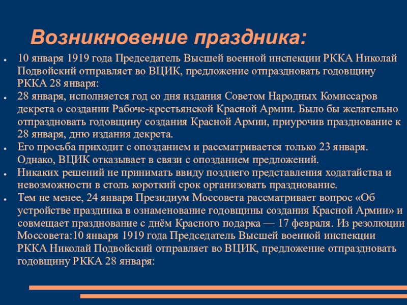 Тем не менее, 24 января Президиум Моссовета рассматривает вопрос «Об устройстве праздника в ознаменование годовщины создания Красной Армии» и совмещает празднование с днём Красного подарка — 17 февраля. Из резолюции Моссовета:10 января 1919 года Председатель Высшей военной инспекции РККА Николай Подвойский отправляет во ВЦИК, предложение отпраздновать годовщину РККА 28 января:
