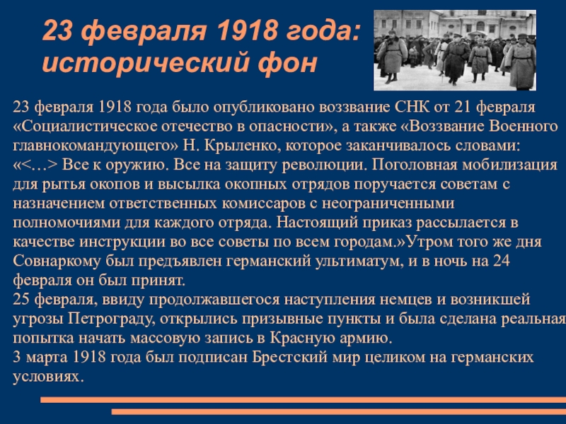 воззвание СНК от 21 февраля «Социалистическое отечество в опасности», а также «Воззвание Военного главнокомандующего» Н. Крыленко, которое заканчивалось словами: «<…> Все к оружию. Все на защиту революции. Поголовная мобилизация для рытья окопов и высылка окопных отрядов поручается советам с назначением ответственных комиссаров с неограниченными полномочиями для каждого отряда. Настоящий приказ рассылается в качестве инструкции во все советы по всем городам.»Утром того же дня Совнаркому был предъявлен германский ультиматум, и в ночь на 24 февраля он был принят.