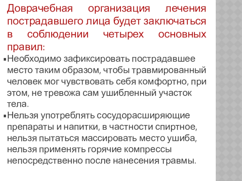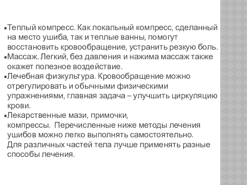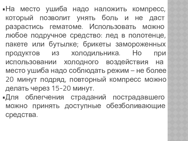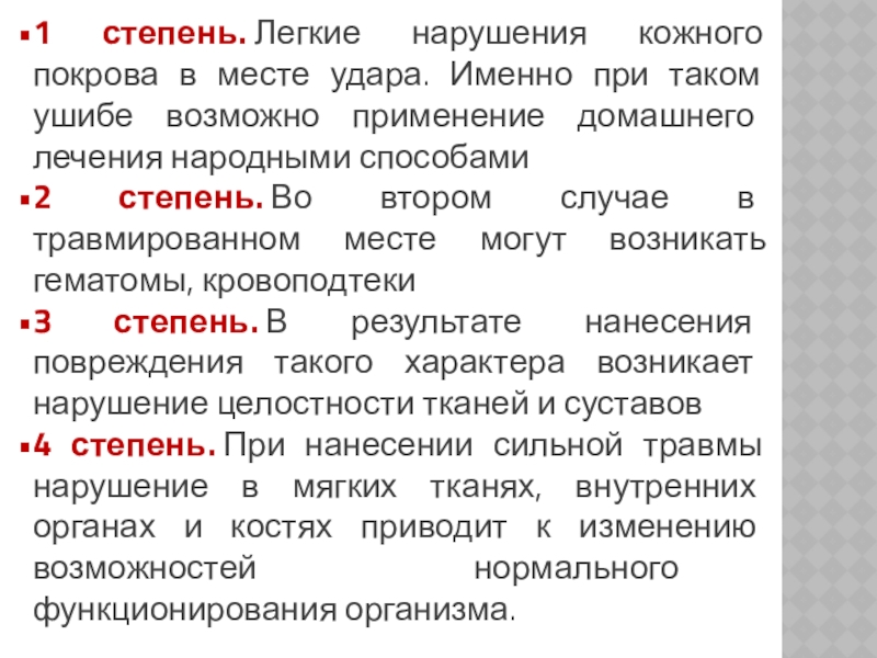 Проявляются симптомы ушиба в виде болевых ощущений в пострадавшем месте, проявлении кровоподтеков и вспухания места травмы.