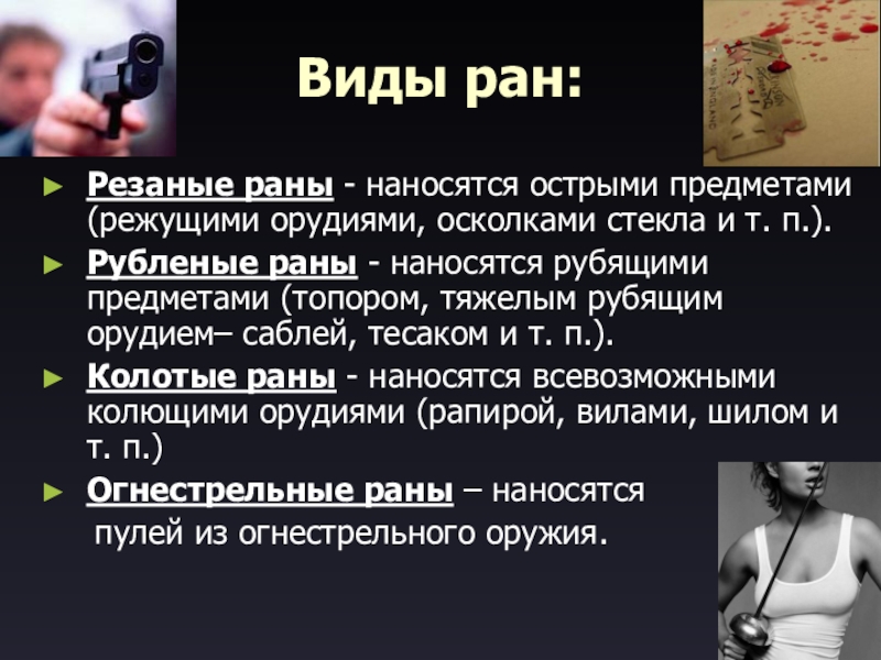 Резаные раны - наносятся острыми предметами (режущими орудиями, осколками стекла