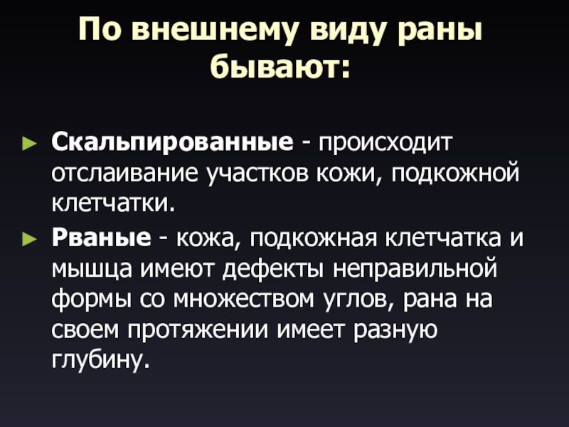 Рваные - кожа, подкожная клетчатка и мышца имеют дефекты неправильной формы со множеством углов, рана на своем протяжении имеет разную глубину.