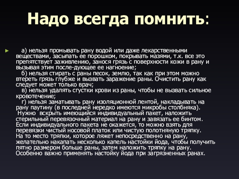 б) нельзя стирать с раны песок, землю, так как при этом можно втереть грязь глубже и вызвать заражение раны. Очистить рану как следует может только врач;