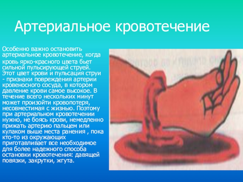 сильной пульсирующей струей. Этот цвет крови и пульсация струи - признаки повреждения артерии кровеносного сосуда, в котором давление крови самое высокое. В течение всего нескольких минут может произойти кровопотеря, несовместимая с жизнью. Поэтому при артериальном кровотечении нужно, не боясь крови, немедленно прижать артерию пальцем или кулаком выше места ранения , пока кто-то из окружающих приготавливает все необходимое для более надежного способа остановки кровотечения: давящей повязки, закрутки, жгута.