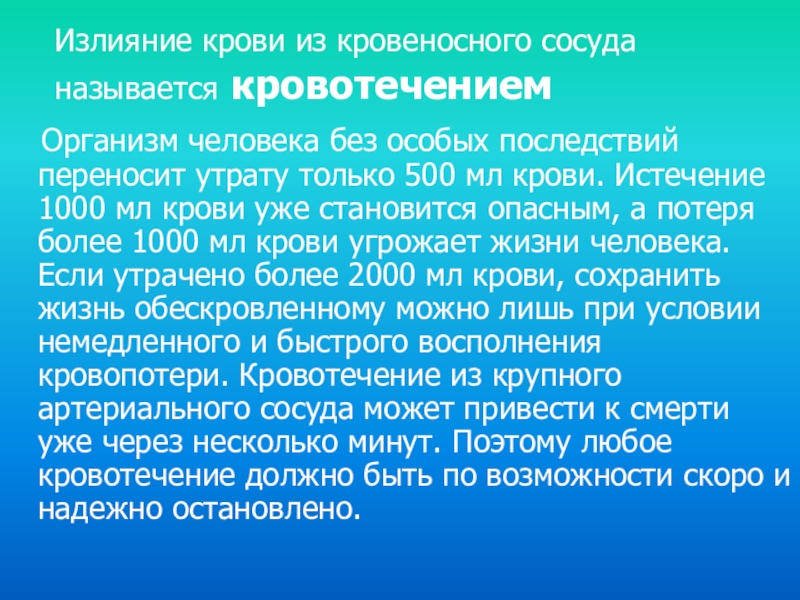 особых последствий переносит утрату только 500 мл крови. Истечение 1000 мл крови уже становится опасным, а потеря более 1000 мл крови угрожает жизни человека. Если утрачено более 2000 мл крови, сохранить жизнь обескровленному можно лишь при условии немедленного и быстрого восполнения кровопотери. Кровотечение из крупного артериального сосуда может привести к смерти уже через несколько минут. Поэтому любое кровотечение должно быть по возможности скоро и надежно остановлено.