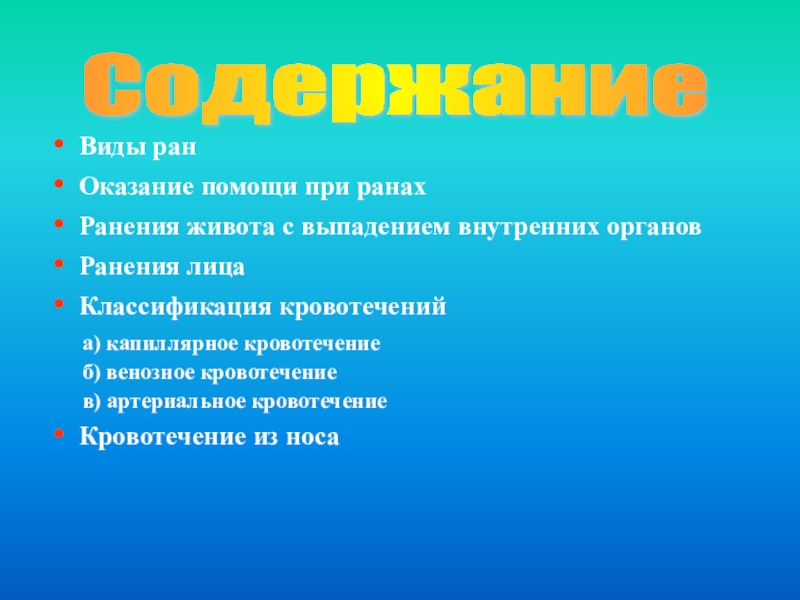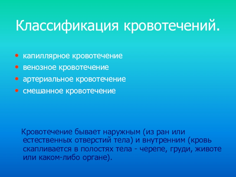 бывает наружным (из ран или естественных отверстий тела) и внутренним (кровь скапливается в полостях тела - черепе, груди, животе или каком-либо органе).