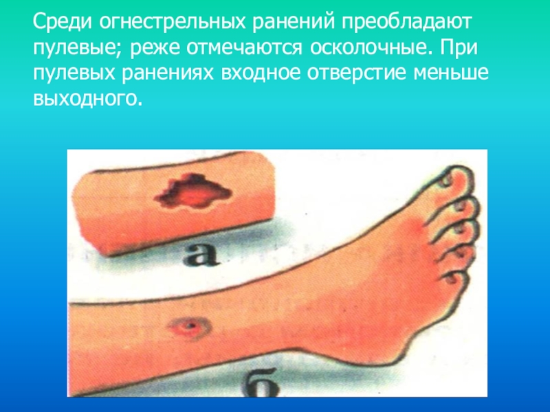 Слайд 6Среди огнестрельных ранений преобладают пулевые; реже отмечаются осколочные. При пулевых ранениях