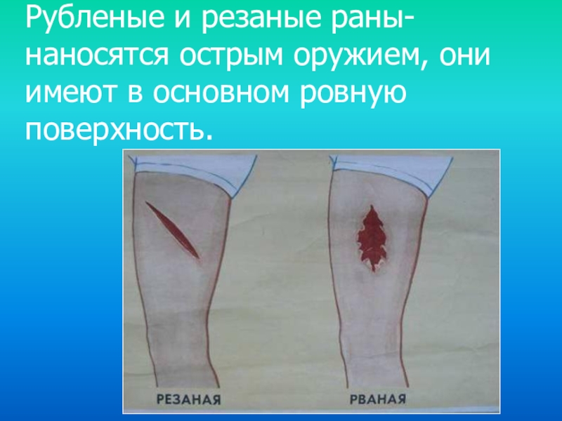 Слайд 4Рубленые и резаные раны- наносятся острым оружием, они имеют в основном