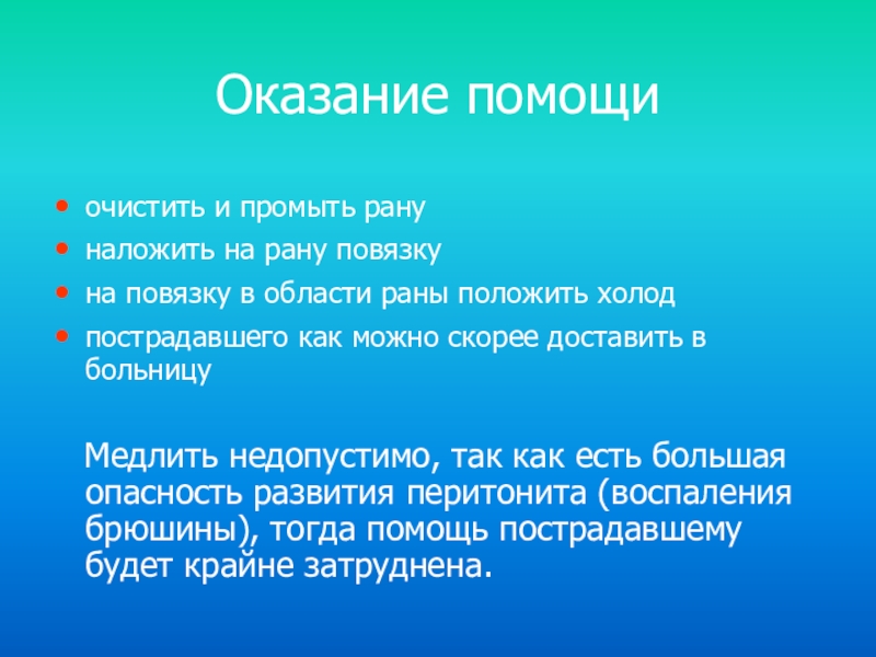 Медлить недопустимо, так как есть большая опасность развития перитонита (воспаления брюшины), тогда помощь пострадавшему будет крайне затруднена.
