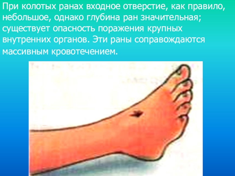 Слайд 7При колотых ранах входное отверстие, как правило, небольшое, однако глубина ран
