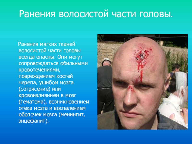 всегда опасны. Они могут сопровождаться обильными кровотечениями, повреждением костей черепа, ушибом мозга (сотрясение) или кровоизлиянием в мозг (гематома), возникновением отека мозга и воспалением оболочек мозга (менингит, энцефалит).